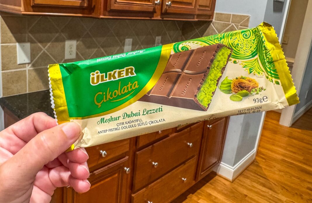 Dubai Chocolate is all the rage online and oddly not the easiest thing to find on the shelves in Raleigh. After a little looking around we found some at the nearby Arabian Delights Market. Dubai chocolate is a bar filled with pistachio cream and crunchy kataifi (shredded phyllo dough) covered in rich milk chocolate.