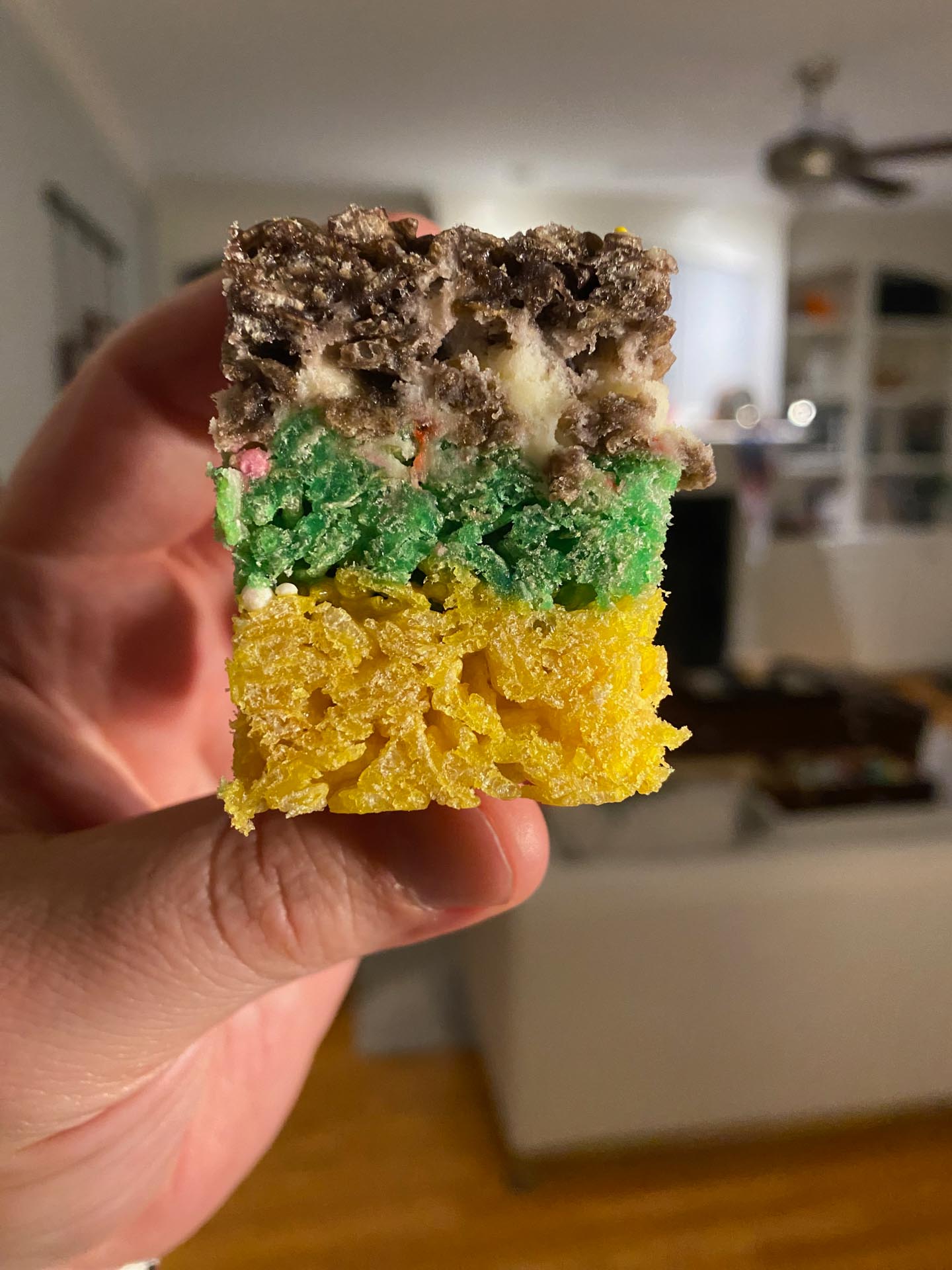 - Add cream cheese mixture between layers of rice krispies.