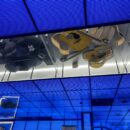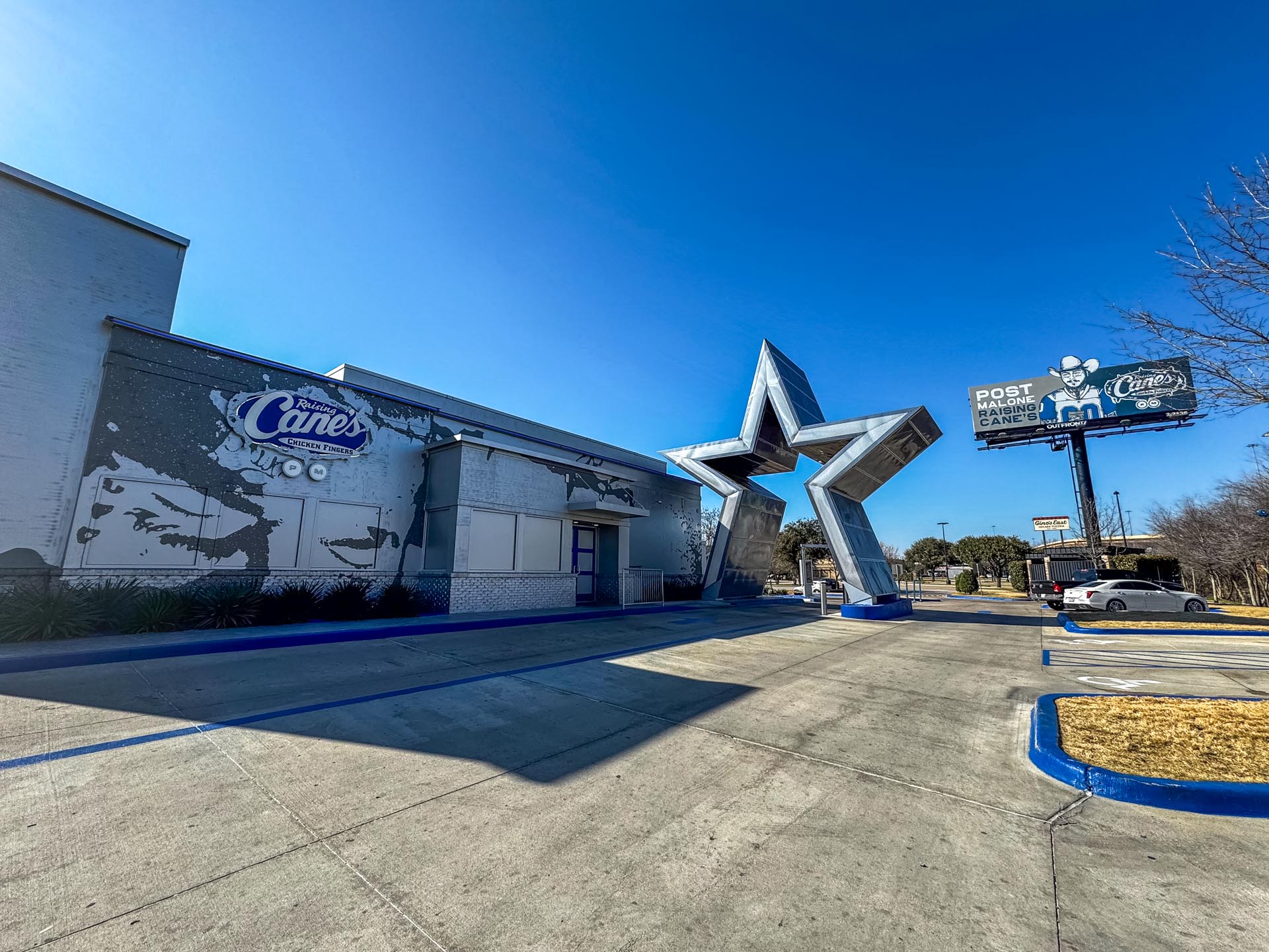 Post Malone is a Dallas native and Cowboys fan. He designed the restaurant to show his love for the team and Raising Cane’s. The exterior has a custom silver vinyl wrap featuring silhouettes of Post Malone. A striking 32-foot-tall Dallas Cowboys star arches over the drive-thru, creating a memorable entrance for visitors.