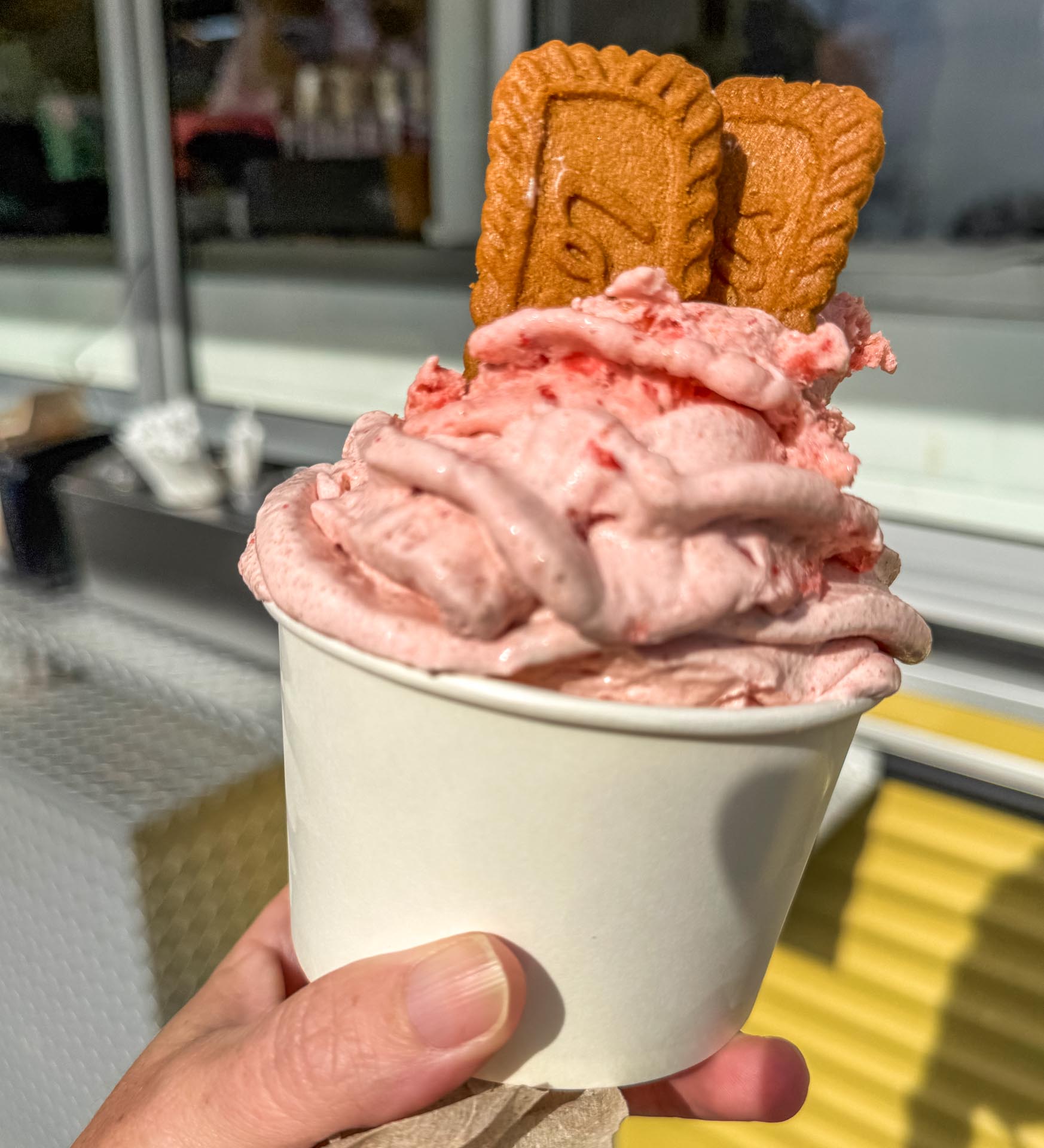 Inside the small market, you’ll find charming home goods, unique gifts, and fresh produce. We couldn’t resist trying their New Zealand ice cream, and it did not disappoint. We ordered the Strawberry Biscoff, which was incredible. New Zealand–style ice cream blends premium hard-packed ice cream with fresh or frozen fruit in a special machine, creating a soft-serve-like treat with real fruit flavor (no syrups or artificial add-ins!). It was absolutely delicious.